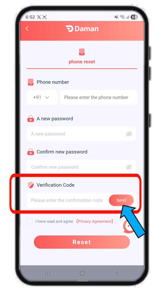 Click the "Send" button to request OTP → You'll get a one-time code via SMS on your registered number. Enter the OTP to verify.